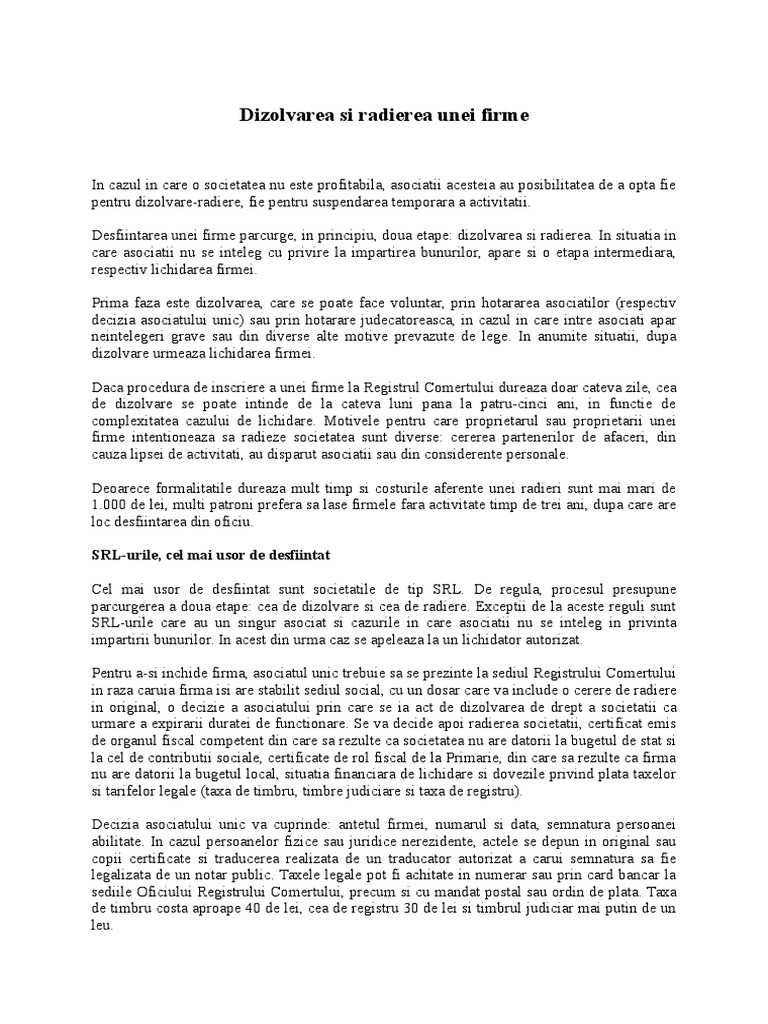 Dizolvarea Lichidarea Si Radierea Unei Firme Srl Sa Potrivit